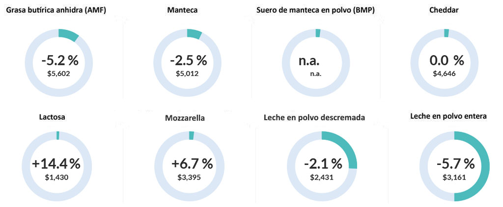 Si los valores de la leche en polvo que arroja el GDT se miden interanualmente, la baja de diciembre del 2024 respecto a diciembre 2025 es del 18.74%, ya que por entonces, la leche en polvo cerraba el año en los U$S3.890 por tonelada.