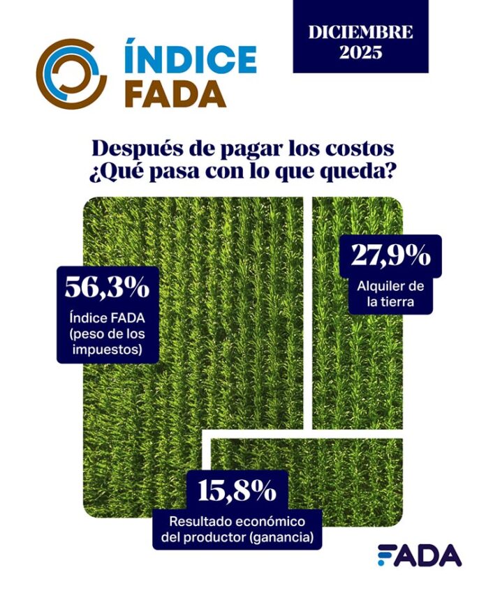 “Los productores enfrentan diferentes costos a la hora de trabajar la tierra: las semillas, los fertilizantes, los salarios, fletes, seguros, etc. Una vez que se cosechan, venden ese cultivo, ya sea soja, maíz, trigo o girasol. La plata que les queda después de pagar todos esos costos se divide en 3: el valor de quienes alquilan la tierra para producir 27,9%, la ganancia 15,8% y los impuestos que se pagan 56,3%. Esto último es lo que medimos en el Índice FADA, cuánto es el peso de los impuestos y cómo se conforman”, agrega Fiorella Savarino, Economista de FADA.