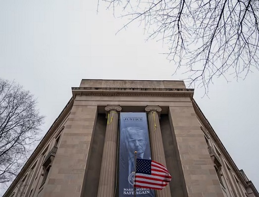 Una pancarta con la imagen del presidente de EEUU, Donald Trump, cuelga del Departamento de Justicia. Ahora la justicia dice que se trat de un error.