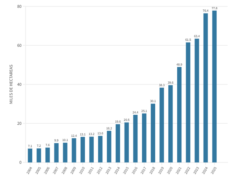 Las cifras de superficie plantada explican gran parte de esta crisis. En apenas cinco años, Chile pasó de cerca de 49.000 hectáreas implantadas a más de 77.700. Es un salto cercano al 60%, equivalente a una tasa anual promedio lineal del 11%. A primera vista, un crecimiento del 11% podría parecer razonable. El problema no es la tasa en sí, sino la base sobre la cual se aplica. Si Chile tuviera 1.000 hectáreas y creciera 11%, sumaría 110 hectáreas adicionales: un volumen marginal en términos de impacto global. Pero crecer 11% sobre 77.000 hectáreas implica incorporar más de 8.000 hectáreas nuevas por año. En términos productivos, eso se traduce en unas 80.000 toneladas adicionales anuales, en su punto de plena producción, que presionan sobre el mercado.