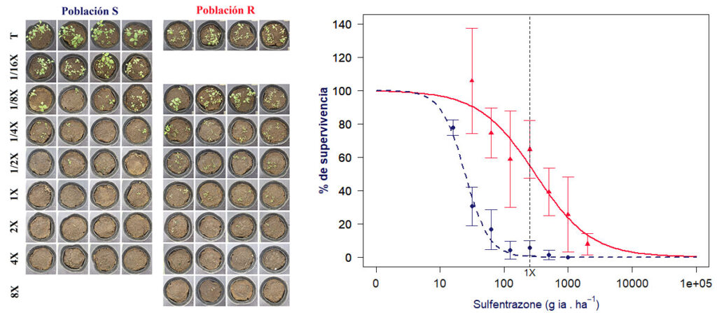 El análisis permitió determinar una DL50 de 24,66 g i.a/ha para la población S y de 306,01 g i.a/ha para la R, lo que representa un factor de resistencia de 12,41, confirmando que la población evaluada posee resistencia heredable a sulfentrazone y descarta fallas operativas o condiciones particulares del ambiente como causa principal.