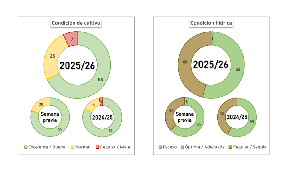 La escasez de precipitaciones sobre el sur del área agrícola comenzó a resentir la condición hídrica del cultivo. La condición Adecuada/Óptima se redujo en 9 p.p., en tanto el área que cuenta con una condición entre Normal y Excelente ronda el 95%. En este contexto será clave la ocurrencia de nuevas lluvias que sostengan el potencial de rendimiento.