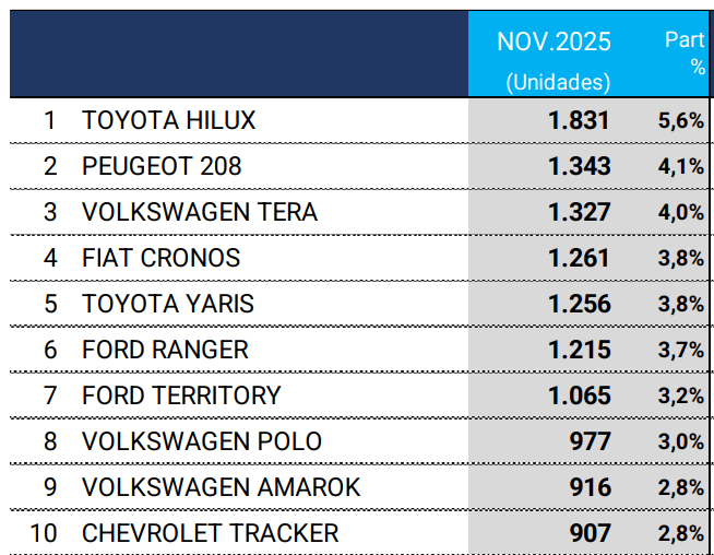 En el listado por modelos livianos, se destaca la Toyota Hilux en el primer lugar (1831 unidades), la Ford Ranger en el n°6 (1215) y la Volkswagen Amarok en el n°9 (916). Así, la pickup japonesa mantiene la cima del ranking, que ostentó también en octubre. En lo que refiere a marcas de automóviles y comerciales livianos, prevaleció Volkswagen, secundado por Toyota y Fiat.