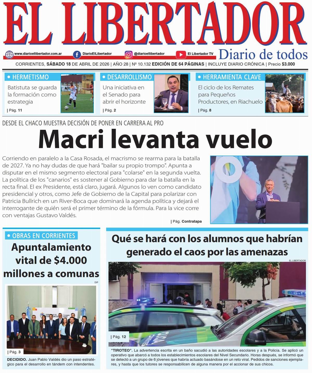 Diario El Libertador de Corrientes presenta su edición digital del 18 de abril de 2026