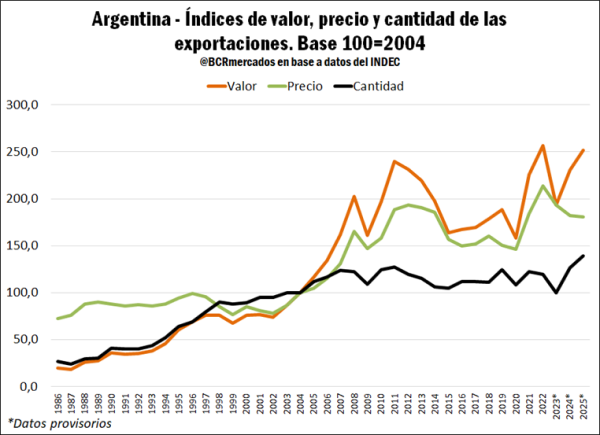 Tal como se mencionó anteriormente, el valor exportado de Argentina en 2025 creció 9,3% respecto a 2024, que se explica por un efecto precio negativo de 0,6% que fue más que compensado por un crecimiento de 10,0% en el índice de cantidades exportadas.