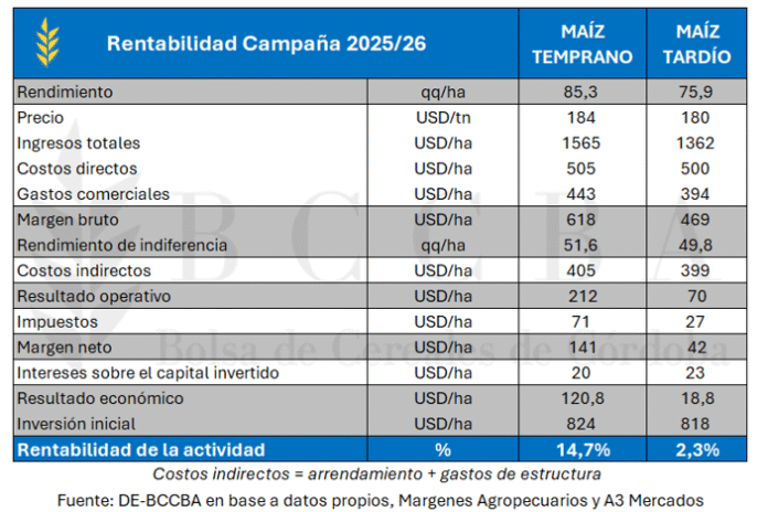 De cara al ciclo comercial 2025/26, se podría observar un mayor volumen remanente de la campaña previa. Tanto el maíz temprano como el tardío presentarían márgenes positivos.