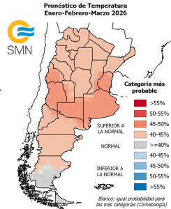 (NAP) El último informe del Servicio Meteorológico Nacional de Argentina, con el pronóstico extendido para el trimestre comprendido entre enero y marzo, está marcado por temperaturas superiores a los promedios históricos en las principales zonas productivas del país.