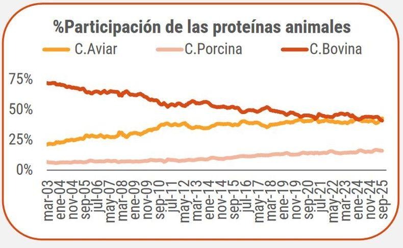 En lo que respecta a la demanda interna, el consumo aparente de proteína animal rondaría los 120 kilogramos per cápita para el año 2025, distribuidos en 52 kilos de carne aviar, 49 de carne bovina y 19 de carne porcina. La participación de la carne bovina cae de forma estructural, mientras la aviar y la porcina ganan espacio debido al factor precio junto con nuevos hábitos del consumidor argentino.