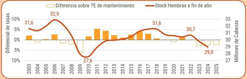 En los últimos años, predominaron tasas de extracción superiores a la de equilibrio. Esta continua liquidación de vientres puede asociarse a necesidades de liquidez y a un contexto financiero poco favorable para la producción, aunque estratégicamente sería necesario retener más hembras para aumentar la oferta.