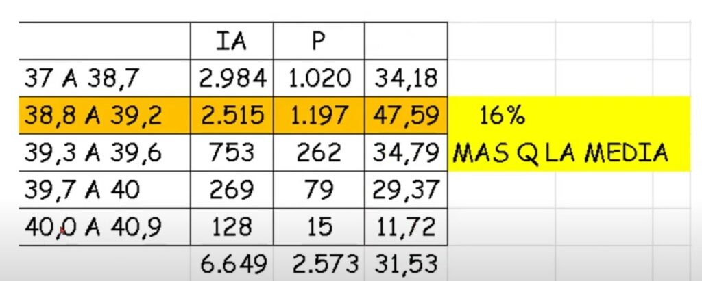 Murray propone medir la temperatura al momento de inseminar. El momento ideal (en naranja) señala que la temperatura corporal debiera estar entre 38,8 y 39,2°c, y si la temperatura es más elevada hay que esperar que se reduzca para inseminar. Murray señala que la temperatura baja 0,1°c por hora.