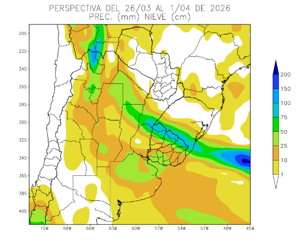 Específicamente, señala que “la mayor parte del NOA, gran parte de la Región del Chaco, el centrode la Mesopotamia, gran parte de Córdoba, el norte y el sudeste de la Región Pampeana y la mayor parte del Uruguay recibirán aportes moderados a muy abundantes (10 a 75 mm), con focos aislados de valores escasos”. Por su parte, el resto del área agrícola recibirá aportes escasos a nulos.