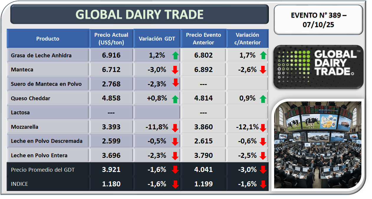 (NAP) La subasta del Global Dairy Trade (GDT) realizada este martes 7 de octubre volvió a dar una señal de debilidad del mercdo lácteo, luego de que el índice general de precios cayó 1,6%, acumulando 4 bajas consecutivas desde mediados de agosto.