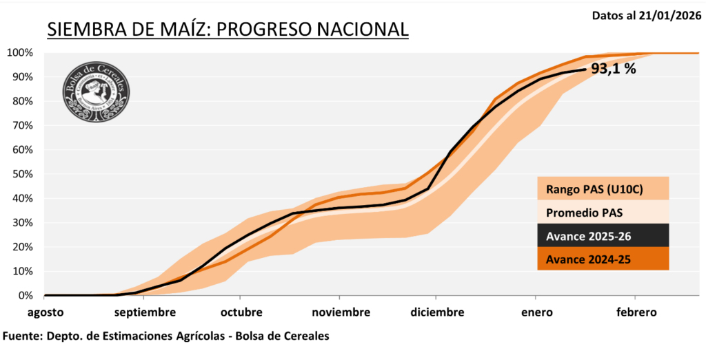 La siembra con destino a grano comercial cubre el 93,1% del área proyectada, aunque registra una demora interanual de -5,3 p.p. Si bien la condición de cultivo oscila alrededor del 83% (entre Normal y Buena), existen deterioros y pérdidas en zonas puntuales. El maíz tardío avanza en su desarrollo, pero la continuidad de su situación dependerá de la reposición de humedad en las próximas semanas.