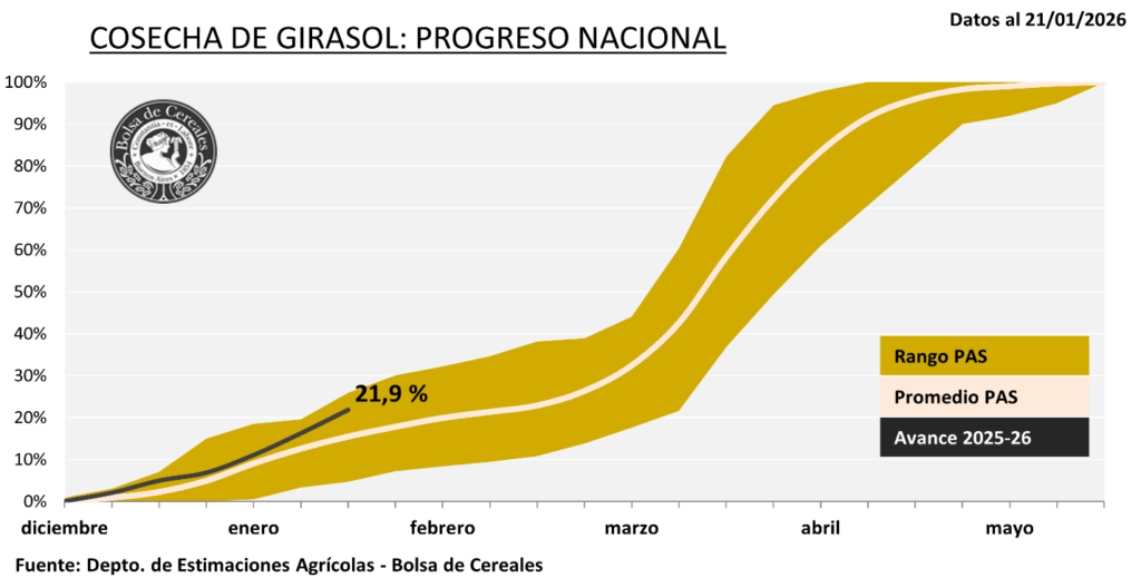 La cosecha de girasol avanzó sobre el 21,9% del área apta, tras un progreso intersemanal de 5,6 p.p. El rinde nacional se mantuvo en 22,6 qq/Ha. Los valores regionales, ubicados entre los 20 y 30 qq/Ha, superaron los promedios zonales históricos.